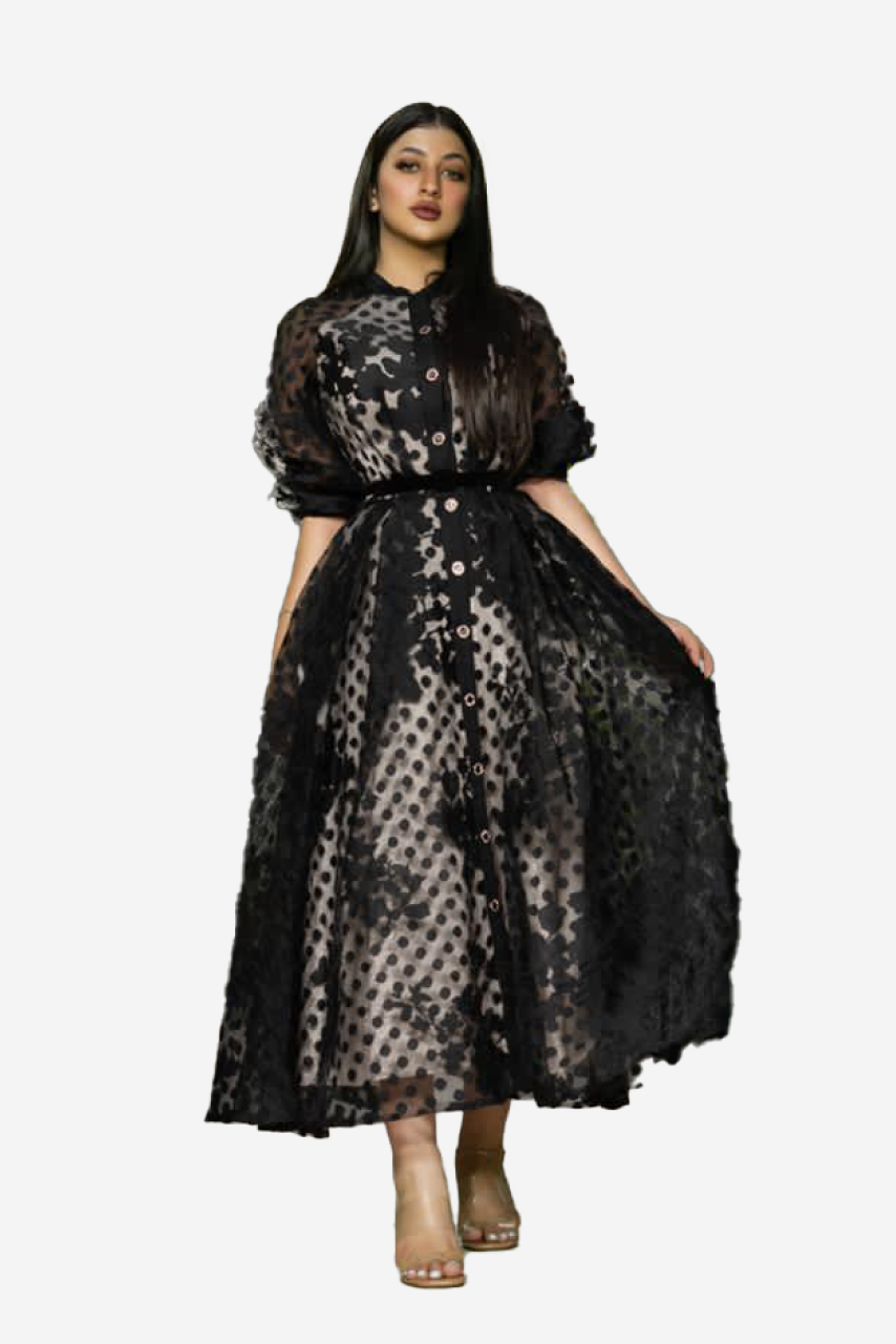 Elevate your evening look with the Black Sheer Polka-Dot Maxi Dress, a captivating blend of vintage charm and modern allure. Crafted from a lightweight, sheer fabric adorned with playful polka dots, this dress is perfect for making a statement. The voluminous puff sleeves and button-down front add a classic touch, while the belted waist defines your figure, offering a chic and flattering silhouette. Ideal for special occasions or stylish events, this maxi dress promises elegance and sophistication.