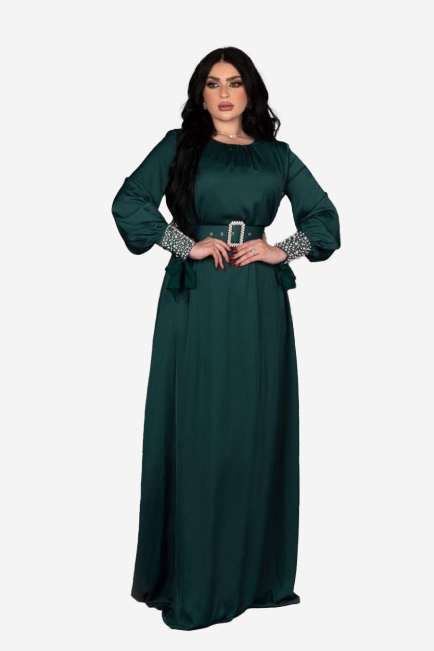 Step into elegance with the Emerald Charm Maxi Dress, a perfect blend of sophistication and luxury. This stunning piece features statement pearl embellishments on the cuffs and belt, adding a touch of sparkle to the deep emerald hue. Designed for both comfort and style, the dress boasts a flowing silhouette and cinched waistline for a flattering fit. Whether it’s an evening gala or a festive gathering, this dress ensures you stand out effortlessly.