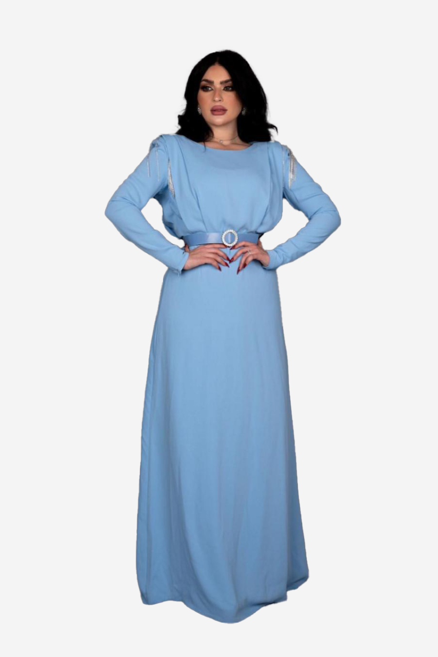 Elevate your wardrobe with the Sky Breeze Satin Maxi Dress, a blend of subtle luxury and contemporary charm. Crafted in a serene sky-blue shade, this dress is perfect for both daytime elegance and evening sophistication. The gown features delicate fringe accents on the shoulders, adding a graceful movement and playful charm. A matching satin belt with an embellished buckle cinches the waist, creating a flattering silhouette.